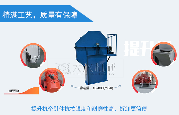 大漢粉料斗式提升機適用輸送堆積密度不大于噸/米 3 的物料的粉狀物料,輸送量5.4-2m3/h,提升高度大能達到40m。