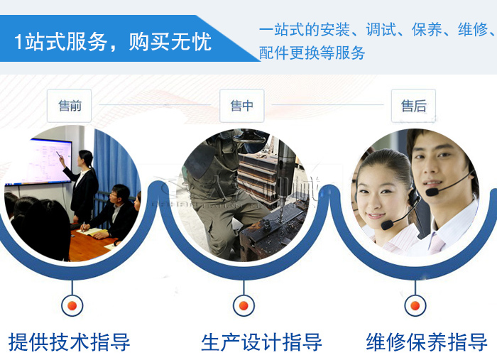 廠家提供免費選型指導,用戶也可以帶料試機,車接車送,也可就近安排現場考察,一站式的安裝、調試、保養、維修、配件更換等服務,讓客戶購買、使用設備更放心,24小時x7全方位服務,我們隨叫隨到。