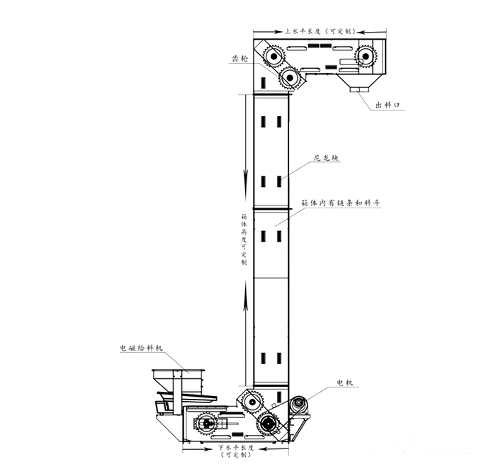 Z型斗式提升機(jī)可根據(jù)提升物料和用戶要求選擇不同的物料和配置。