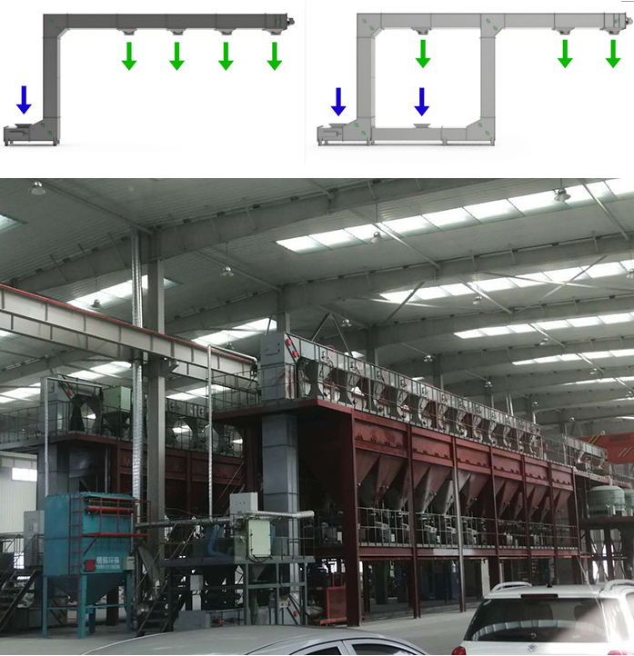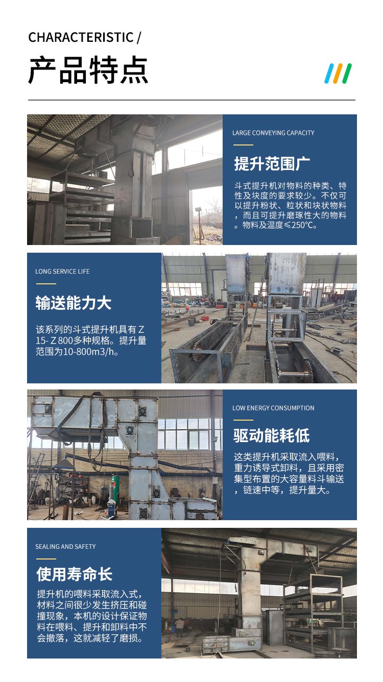 Z型提升機(jī)由于其組成靈活多變,機(jī)身緊湊,水平-垂直-水平輸送方式,大大減少了設(shè)備占地較大的情況。